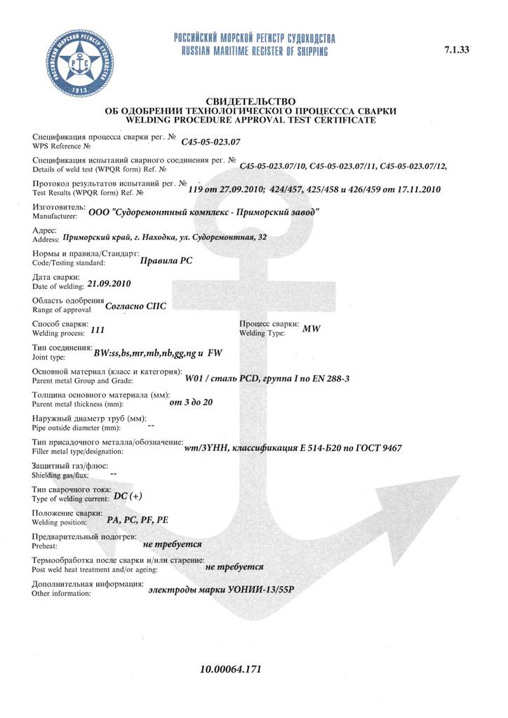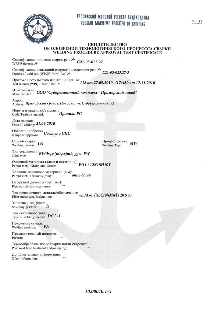 Свидетельство об одобрении технологического процесса сварки