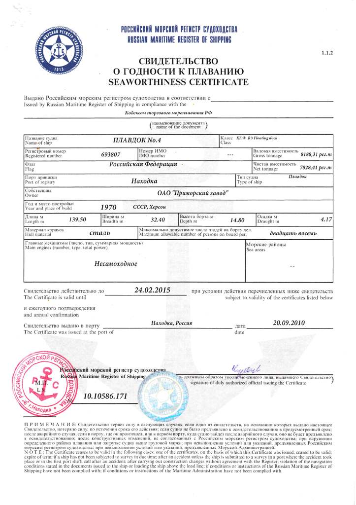 Док,№ Класс РМРС Проект Материал корпуса Грузоподъемность, т Длина, м Ширина, м Высота борта,м Осадка,м Валовая вместимость, рег.т Кол-во и грузоподъёмность кранов, т плавдок №2 K*R3 Floatimg dock 122 А бетон (понтон и башни) 6000 131,8 22 14,6 4,16 8 785,6 2x5 т плавдок №4 K*R3 Floatimg dock 1760 бетон (понтон), сталь (башни)