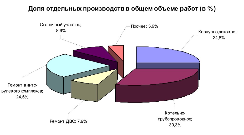 Наибольший объем работ выполнен специалистами котельно-трубопроводного производства (30,3%), производства по ремонту винто-рулевого комплекса (ВРК – 24,5%), корпусно-докового производства (24,8%).