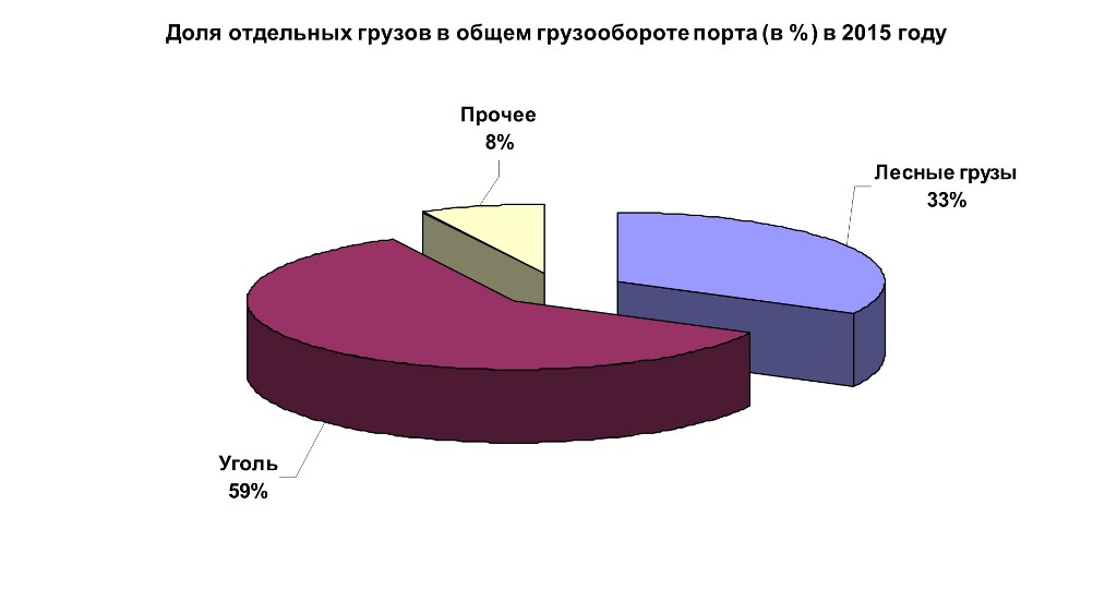 Второй год подряд дирекция порта отмечает увеличение доли лесоматериала в общем грузообороте: если в 2013 году лес и пиломатериал составляли примерно 4% грузооборота, то в 2014 году этот показатель увеличился до 13%, а в 2015 году – до 32,9%. Основным грузом по-прежнему является уголь – 59,6% от общего объема. Предприятие также перегружало цемент, металлоконструкции, химические удобрения и пр. (7,5% от грузооборота).