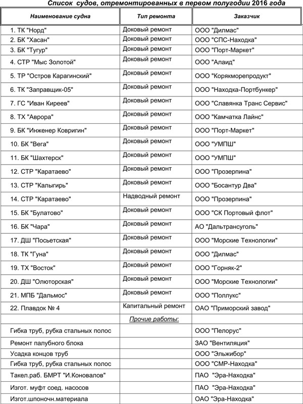 Объем производства «Судоремонтного комплекса-ПЗ» в первом полугодии 2016 года увеличился в сравнении с аналогичным периодом прошлого года на 48%. Специалисты предприятия выполнили ремонт на 22 судах. Наиболее крупные ремонты были произведены на следующих судах: