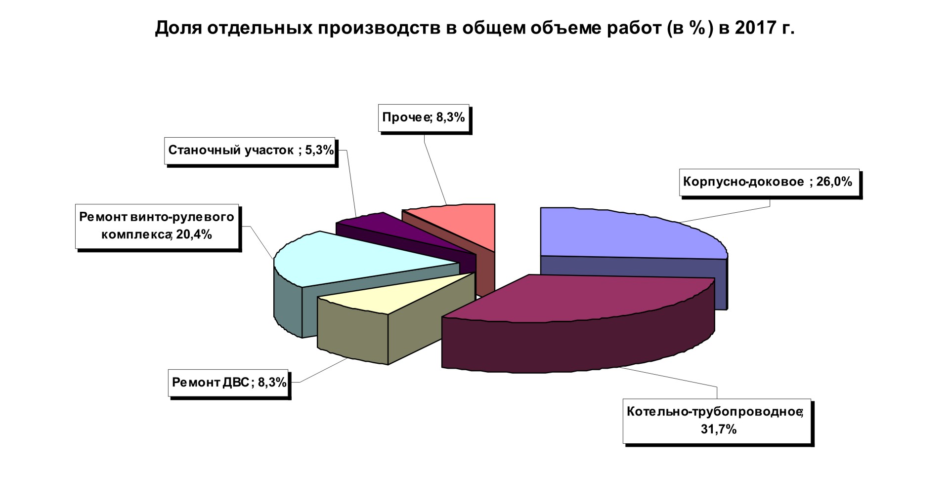 В денежном выражении объем производства увеличился в сравнении с 2016 годом на 8,1%. Наибольший объем работ выполнен специалистами котельно-трубопроводного производства (см.схему) – 31,7%, корпусно-докового производства – 26%, слесарно-механического производства по ремонту винто-рулевого