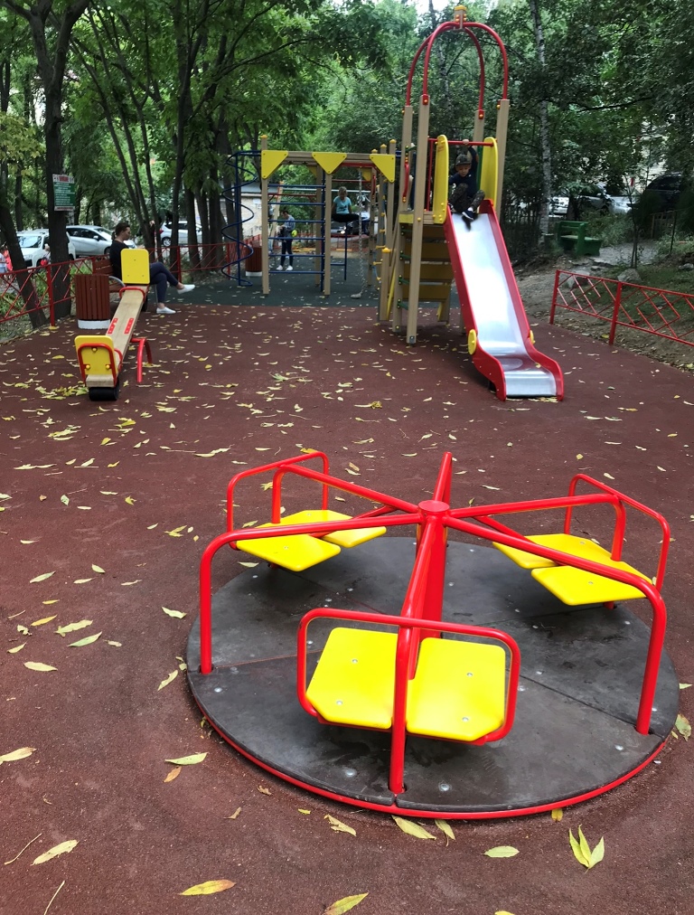 Для активных детских игр установлены качели, карусель, горки, спортивный комплекс. Основание площадки покрыто резиновой крошкой и огорожено по периметру металлическими панелями.