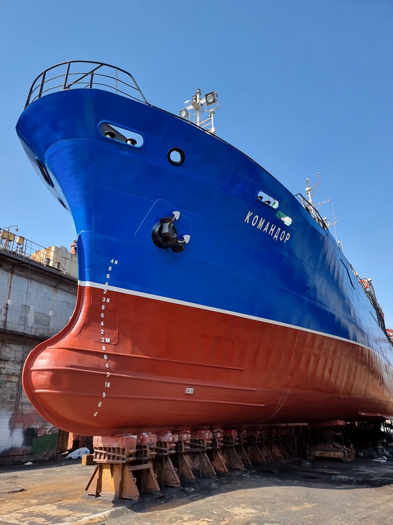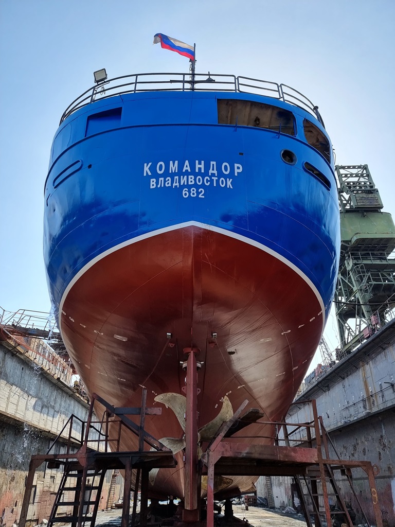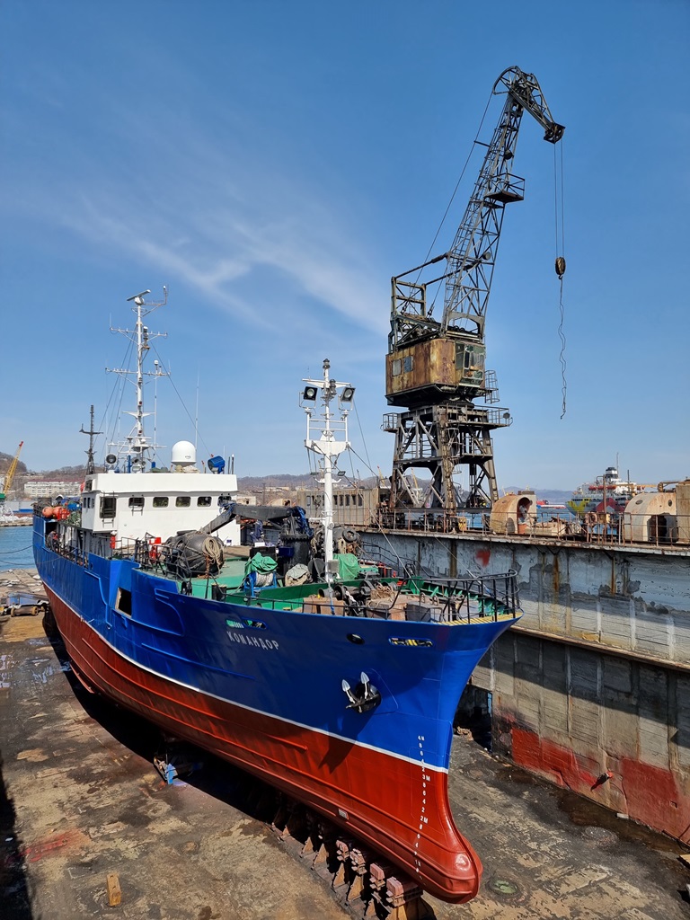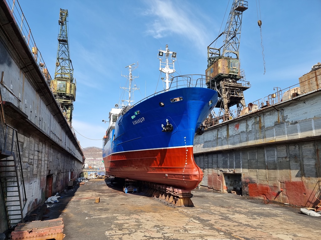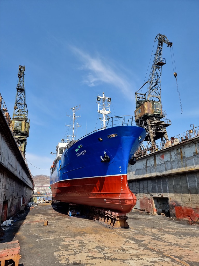 Судоремонтники «Приморского завода» завершили ремонт рыболовного судна «Командор». Дедвейт судна - 468.000 т, длина - 55.20 м, ширина – 9.20 м, год постройки - 1990 г. Порт приписки: Владивосток.
