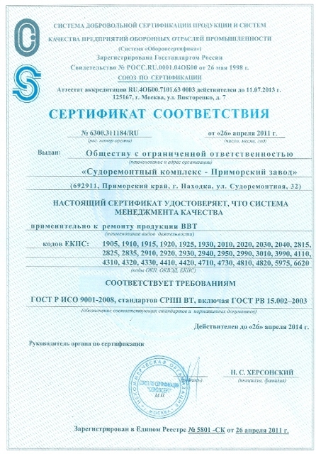 В конце апреля 2011 года предприятие получило СЕРТИФИКАТ СООТВЕТСТВИЯ, подтверждающий, что СИСТЕМА МЕНЕДЖМЕНТА КАЧЕСТВА применительно к ремонту продукции Вооружения и Военной техники, соответствует требованиям ГОСТ Р ИСО 9001-2008, стандартов СРПП ВТ, включая ГОСТ РВ 15.02-2003.