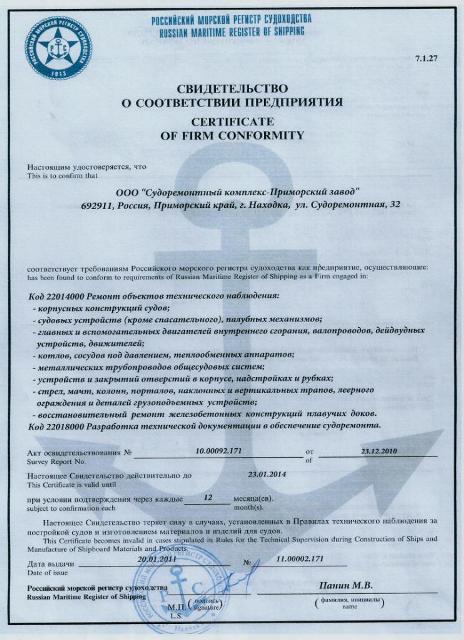 2) Свидетельство о соответствии предприятия, выданное Российским морским регистром судоходства, 23.12.2010 г.
